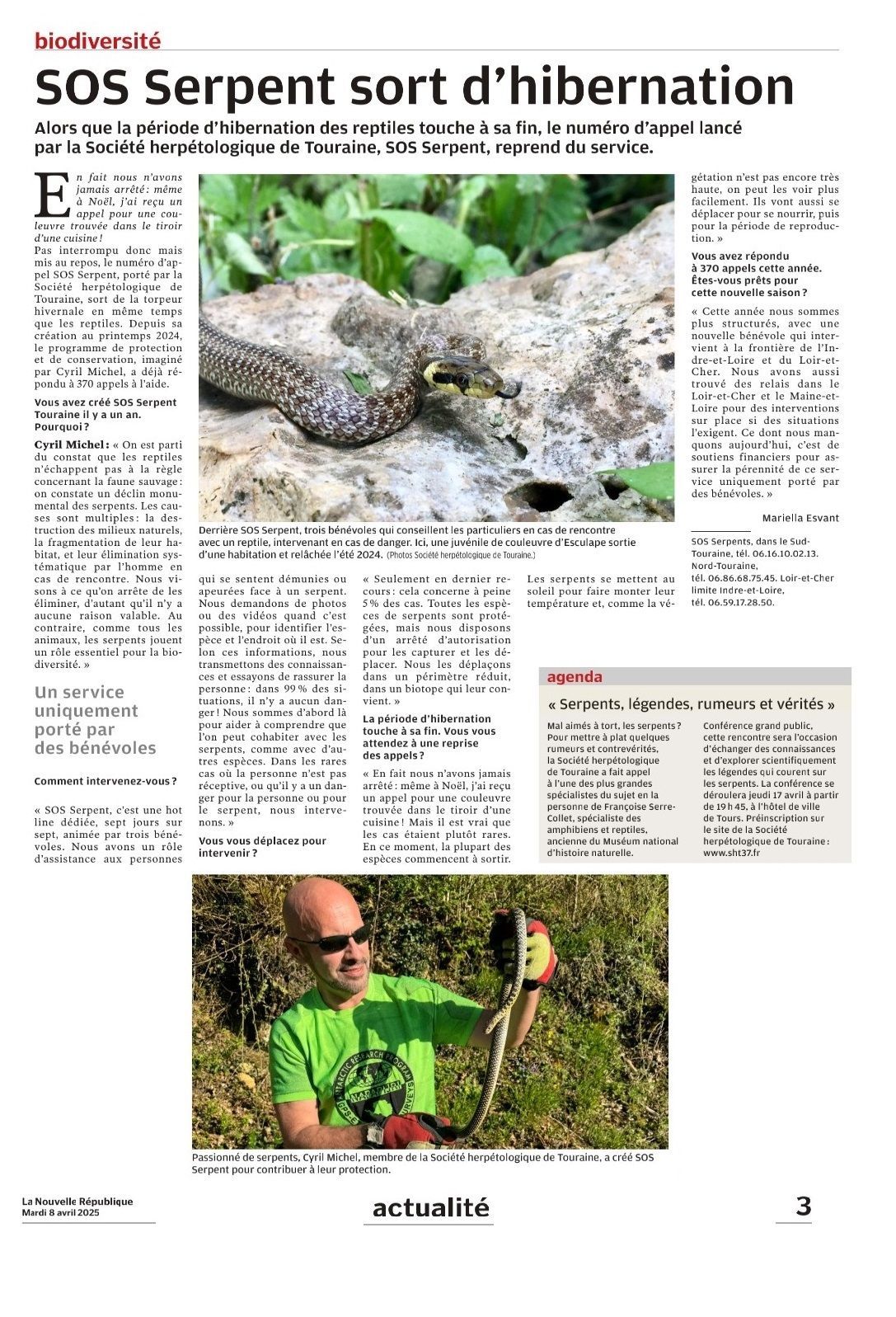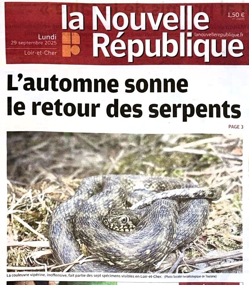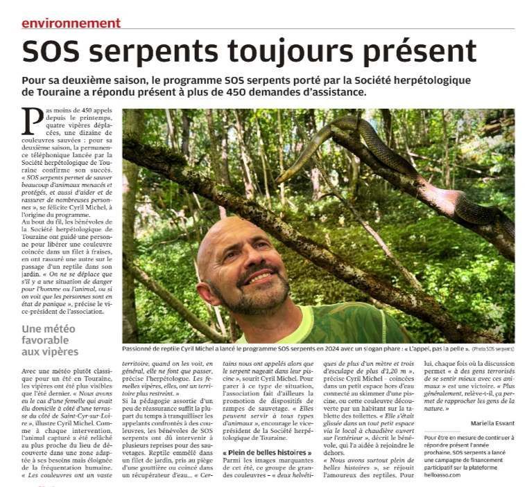 pour la diffusion de ce bel article Indre-et-Loire et centre de la France, le 20 septembre 2025, avec une interview en notre compagnie. Merci pour cette belle mise en lumière d'un échantillon de nos actions, assistance aux personnes, et sauvetages SOS SERPENT 2025.