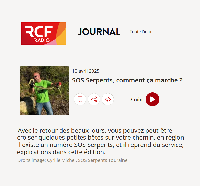 Lundi 16 septembre 2024, le journal régional RCF a souhaité présenter SOS SERPENT: A cette occasion nous avons donné une interview à l'antenne et vous pouvez écouter le replay ICI: