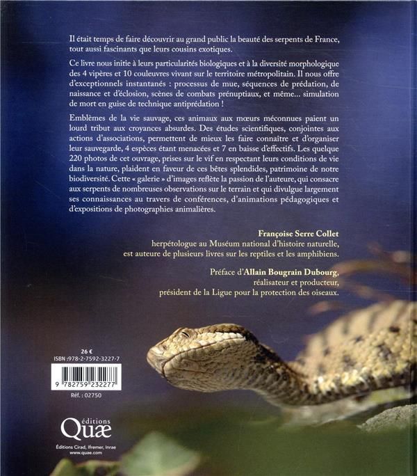 - Ce livre nous initie aux particularités biologiques et morphologique des 4 vipères et 10 couleuvres vivant sur le territoire métropolitain. Il vous offre d’exceptionnels instantanés : processus de mue, séquences de prédation, de naissance et d’éclosion, scènes de combats prénuptiaux, et même... simulation de mort en guise de technique anti-prédation !