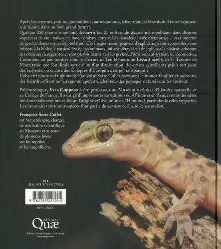 - 250 photos vous font découvrir les 21 espèces de lézards métropolitains dans diverses séquences de vie : naissance, mue, combats entre mâles dans leur livrée prénuptiale… sans omettre de spectaculaires scènes de prédation. Ces images, accompagnées d’explications très accessibles, nous initient à la biologie particulière de ces animaux qui acquièrent leur énergie par la chaleur, arborent des couleurs changeantes et sont parfois nantis, tels les geckos, d’un étonnant système de locomotion.